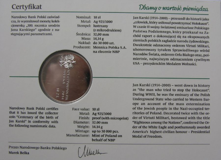 10 złotych - 100. rocznica urodzin Jana Karskiego