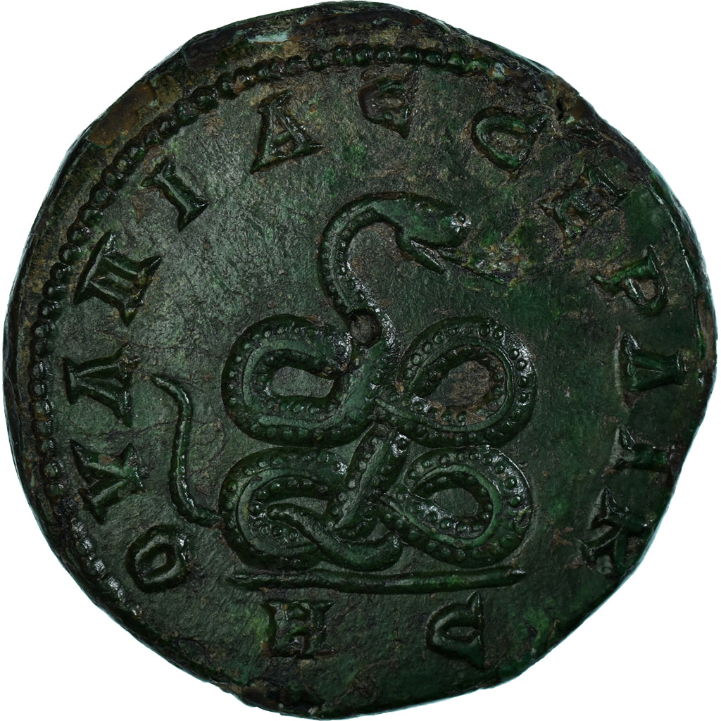 Zwinięty wąż z głową w prawo. Wspaniała patyna o jednolitym szmaragdowym kolorze. Wspaniały okaz, prawdopodobnie najwspanialszy znany tego typu egzemplarz. Centralne otwory, które służyły do stabilizacji i centrowania flana przed uderzeniem, są ledwo zauważalne i pomogły w umożliwieniu tego wspaniałego, dobrze wyśrodkowanego uderzenia. Ruzickiej 359; AMNG 256. Ex Naville Numismatics 45, 2018, partia 146.AYT K M AYP CEY H ANTΩNEINOCOYΛΠIAC CEPΔΙΚ//HC17,86 gr